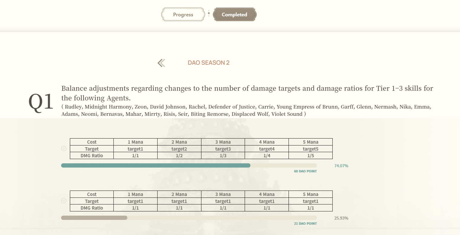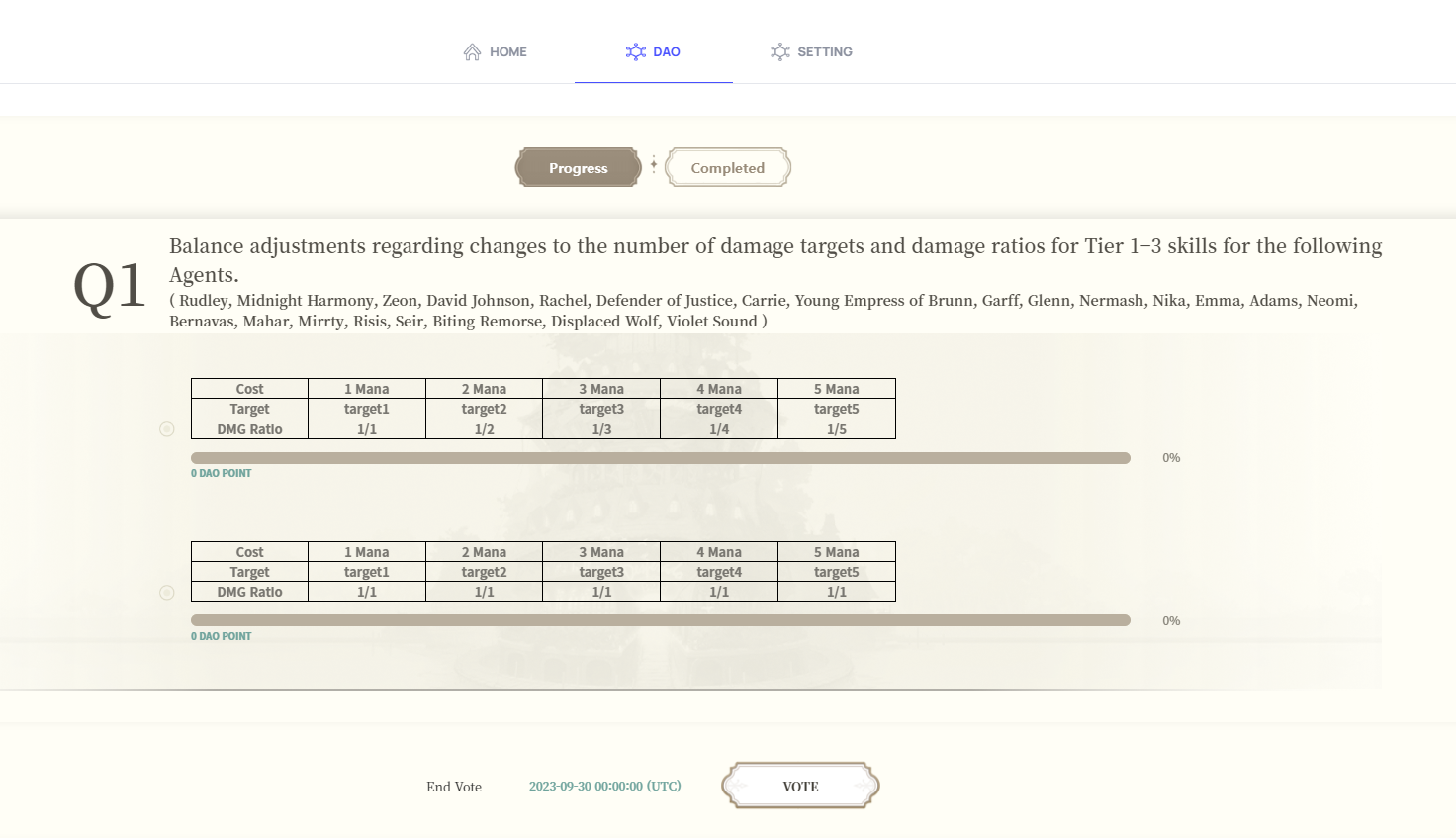When DAO is in progress, the ongoing agenda is displayed on the DAO - DAO - Progress screen. On this screen, after selecting the outcome you wish to vote for in the agenda you want, you can click the VOTE button to cast your vote using the DAO Points you own.