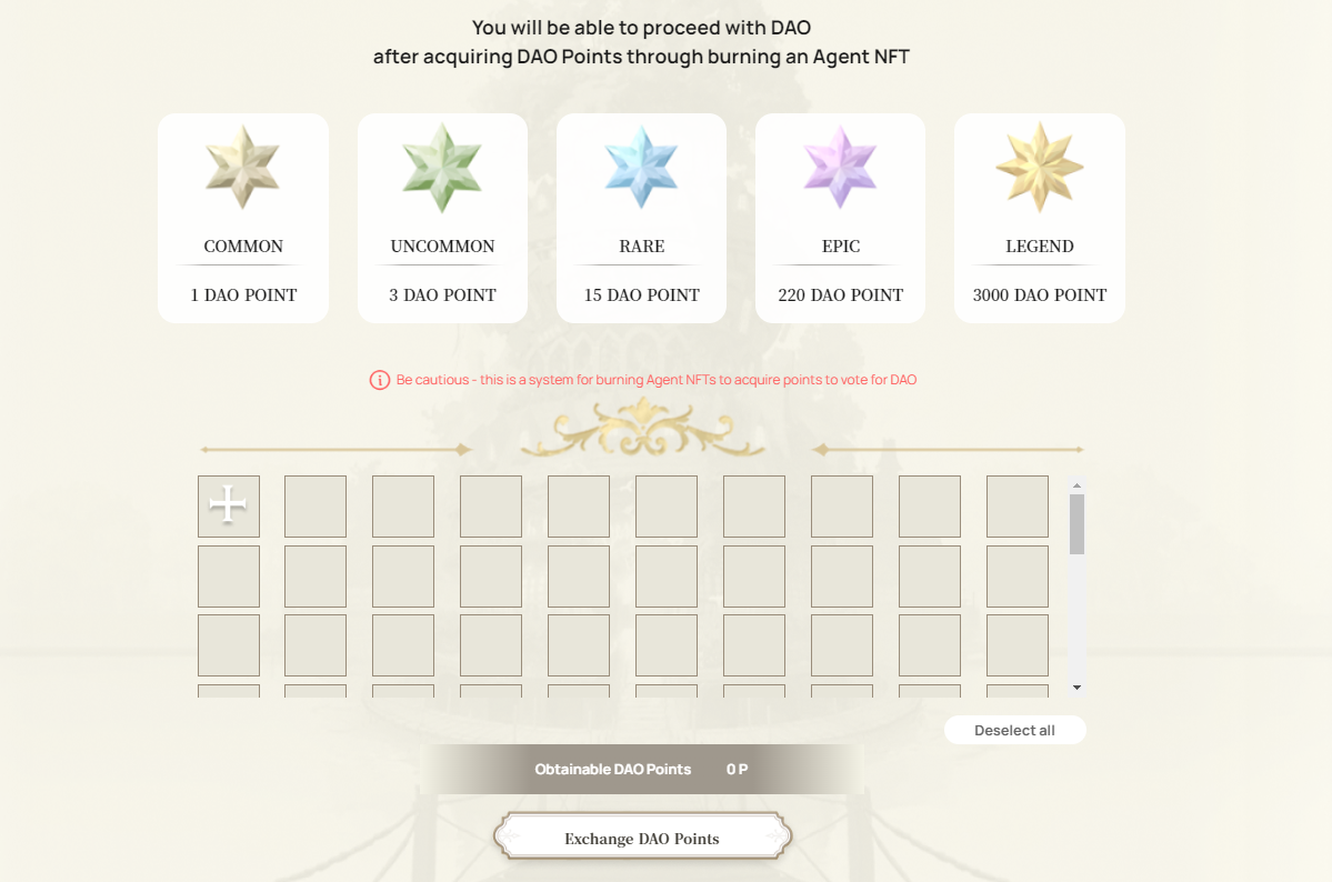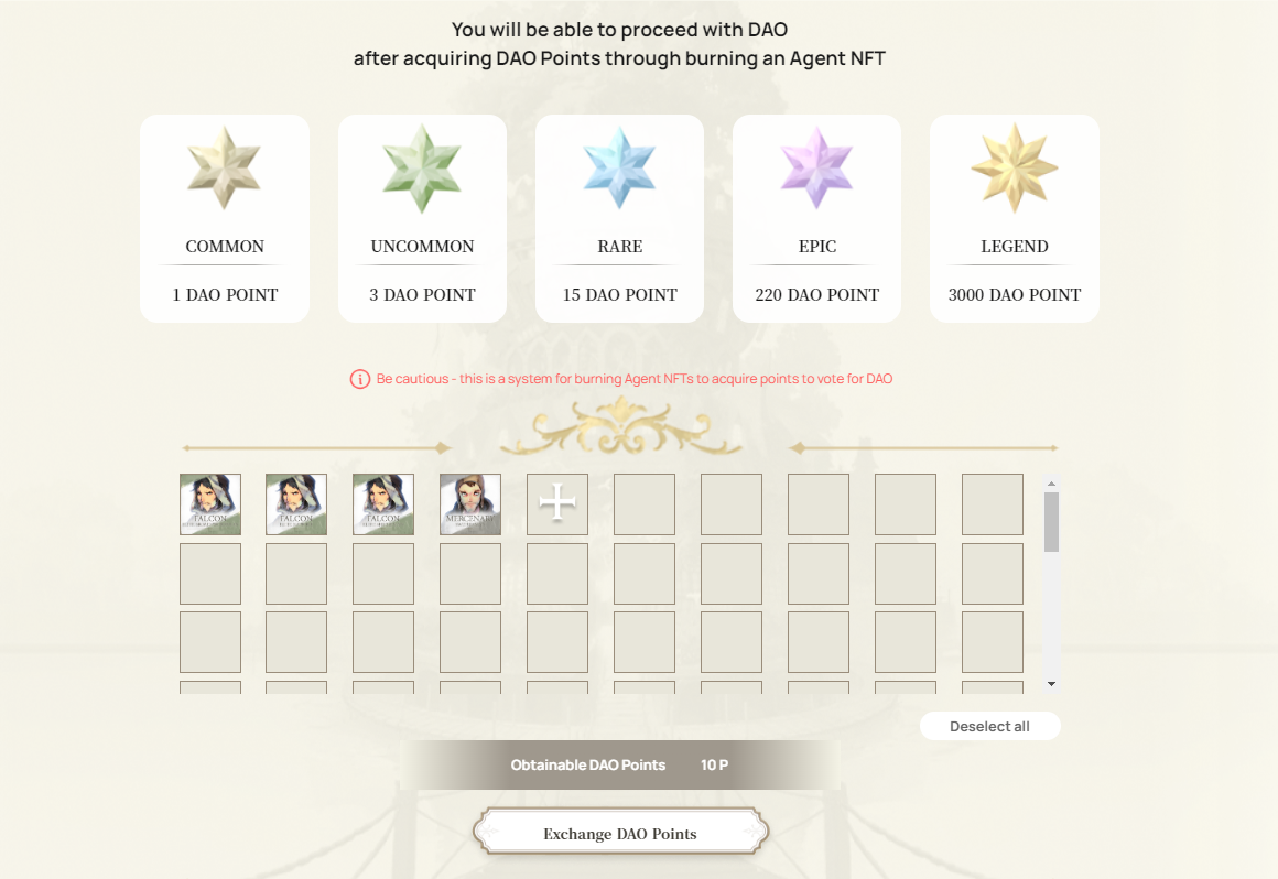 When you exchange the selected Agent for DAO Points, that Agent will be burned as part of the process. Please be aware of this when participating in DAO activities.