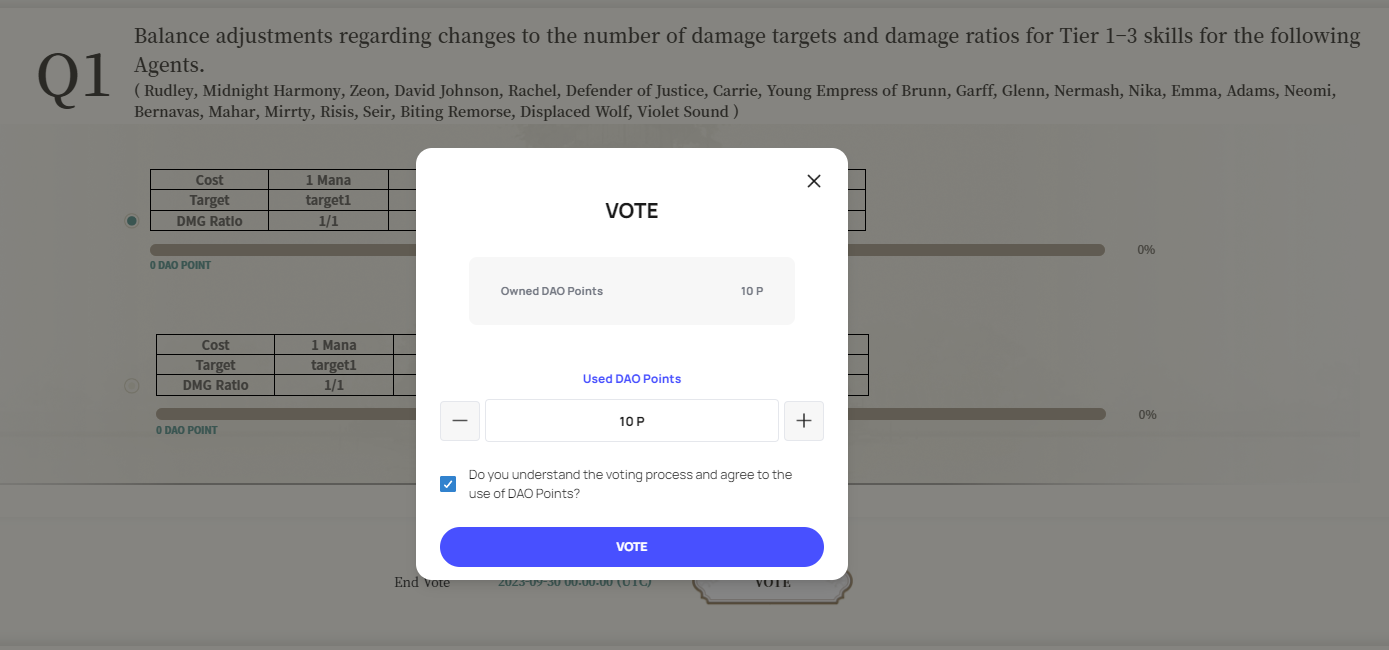 If a user wants to strongly support a particular outcome on an agenda, they can use as many DAO Points as possible to VOTE for it. The real-time status of votes from other users on the agenda is also displayed, so we encourage continuous interest and monitoring of it throughout the duration of the DAO.