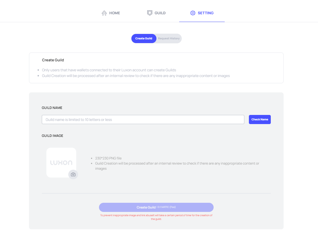 A fee of 10 MATIC is required when submitting a GUILD creation request.