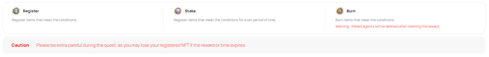 While progressing QUESTs, users need to register the required NFTs according to the registration method specified in that QUEST. The following are the registration methods.